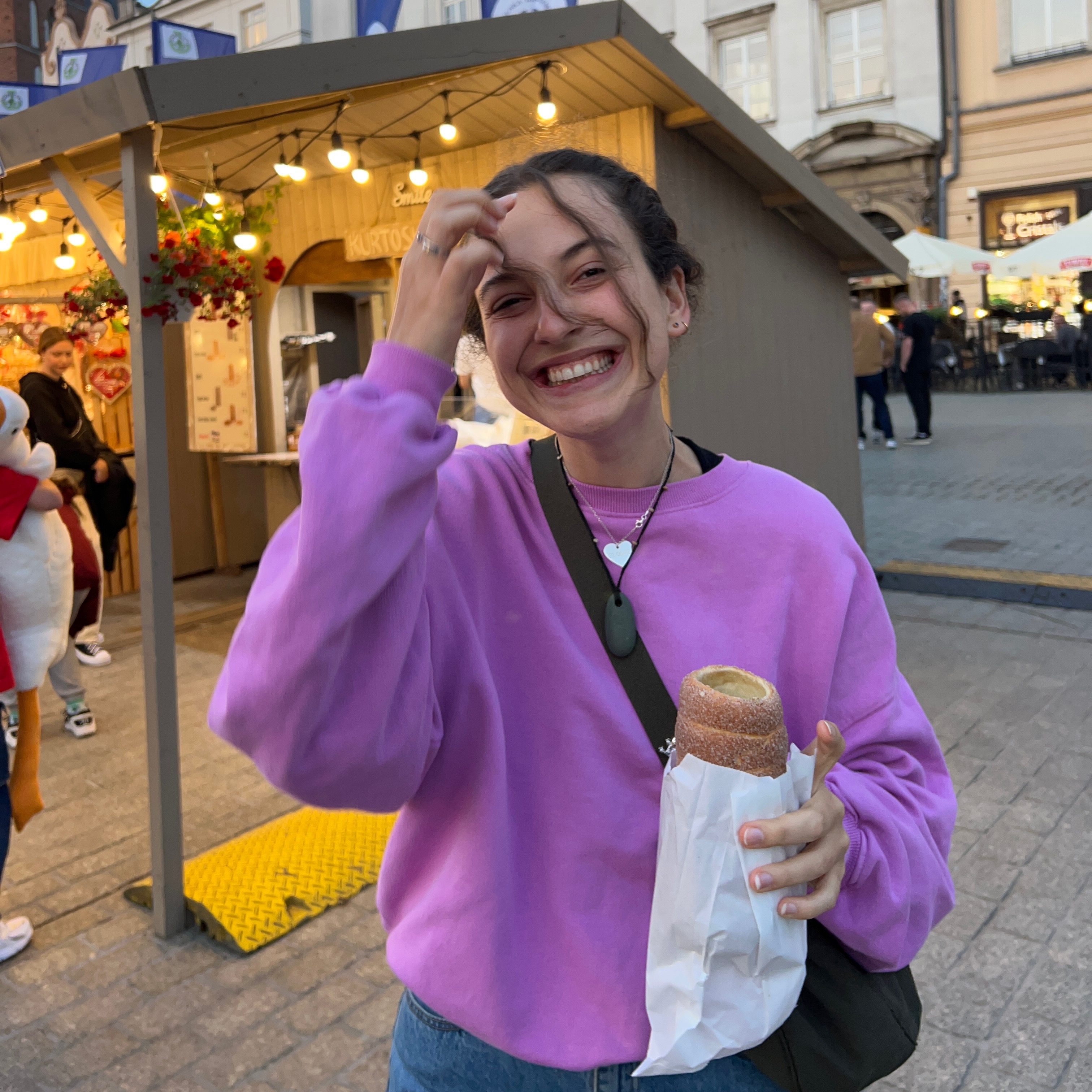 This evening we decided to forgo the restaurants in favour of Krakow’s Main Square Market. It’s a permanent Christmas Market with the most delicious range of Polish food. They’ve got everything from pierogi to parówki cielęce (a Polish hot dog) and, my favourite, Chimney Cakes. I’m not usually a cake person, and I don’t like doughnuts or churros (I know, wow), but there’s just something about those little morsels of dough covered in cinnamon sugar that I LOVE.